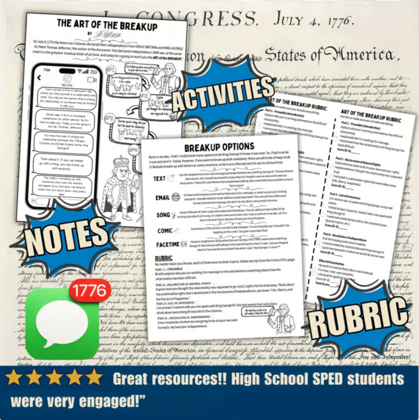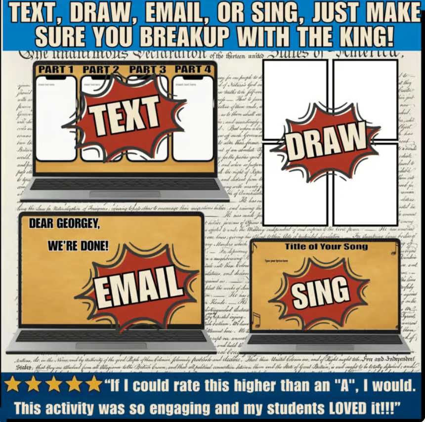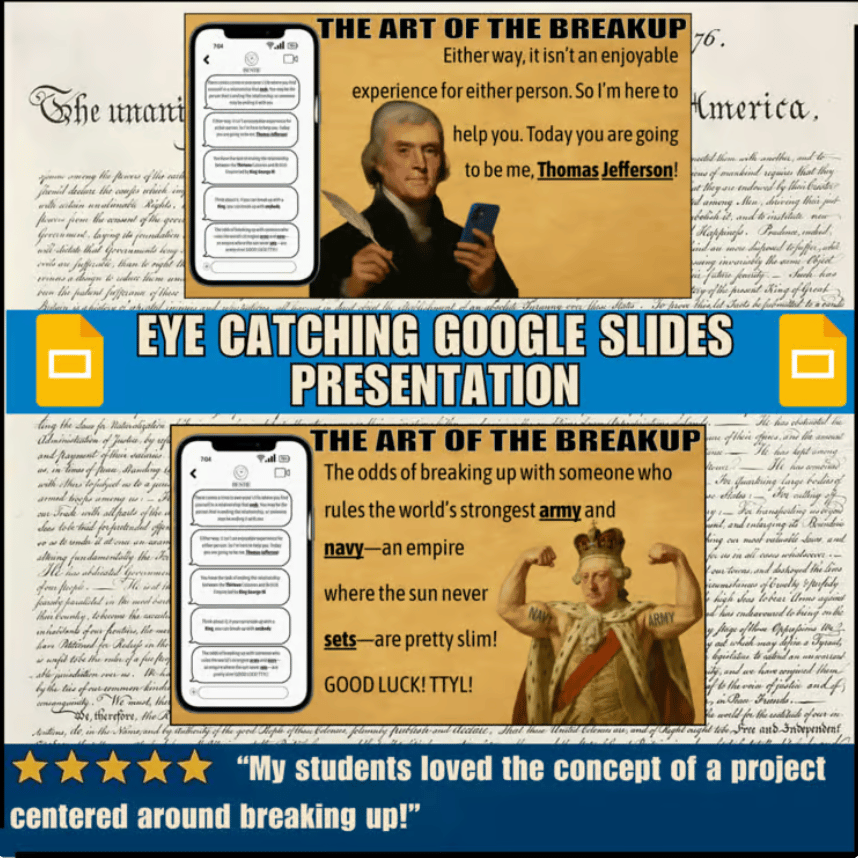 Engage your students with these creative Declaration of Independence activities! Students write or record "breakup" letters to King George III, reinforcing the key ideas behind the Declaration in a modern, interactive way. Includes handouts and Google Slides templates!