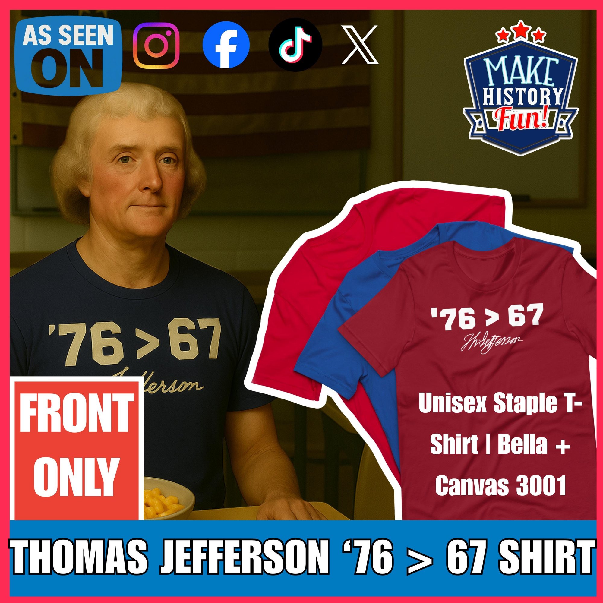 This is the original '76 is greater than 67 shirt as worn by Thomas Jefferson and seen on TikTok, Instagram, and Facebook. This shirt is taking over feeds faster than you can say “1776 was built different.”